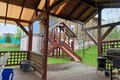 Просторная беседка - зона барбекю, с мангалом, большим столом и садовыми качелями. Детская площадка.